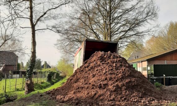 De nieuwe compost komt! Het Voedseltuinwerk geeft in het vroege voorjaar groenten uitplanten maar vooral veel kruiwagens compost kruien. We spitten de grond niet om maar brengen ieder jaar een nieuwe laag compost op de teeltbedden. Dat is goed voor het bodemleven en het broodnodige vruchtbaarder maken van onze zandgrond. We werken immers zonder kunstmest.