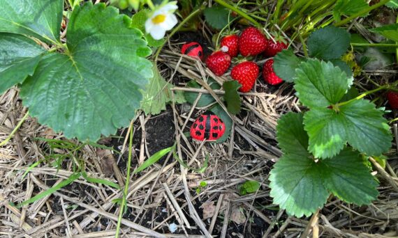 Het hele voorjaar hebben roodgeverfde steentjes en schelpen tussen de kleine aardbeiplantjes gelegen. Nu zijn ze bijna niet meer terug te vinden, maar het lijkt wel alsof ze hun werk gedaan hebben? Vier jaar geleden hebben we de eerste aardbeiplantjes op de Voedseltuin gezet, een grote hoek vol met het ras Korona. Die naam was